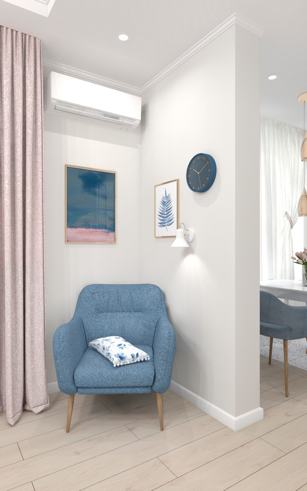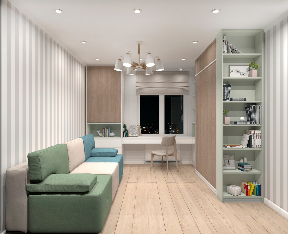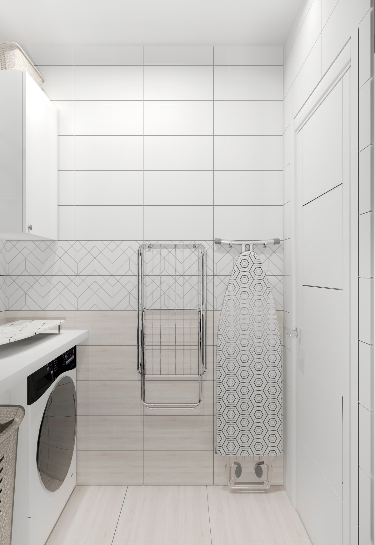 В квартире получилось организовать достойные места хранения в каждой комнате. Маленький СУ пожертвован под хозяйственную комнату, где расположилось постирочное и гладильное оборудование. Кабинет с помощью декора легко преображается в детскую.
