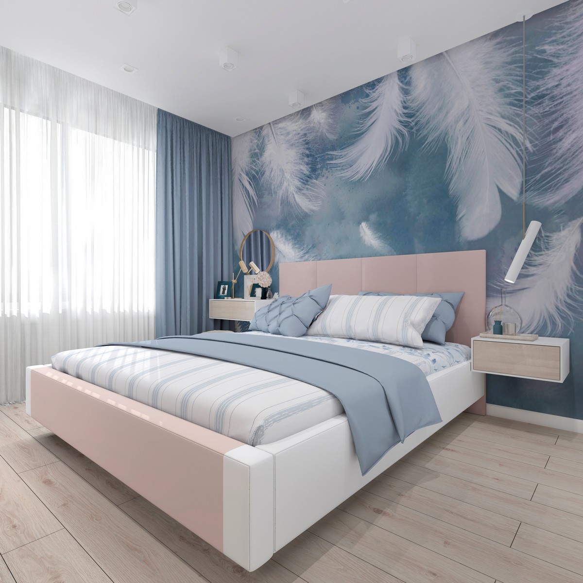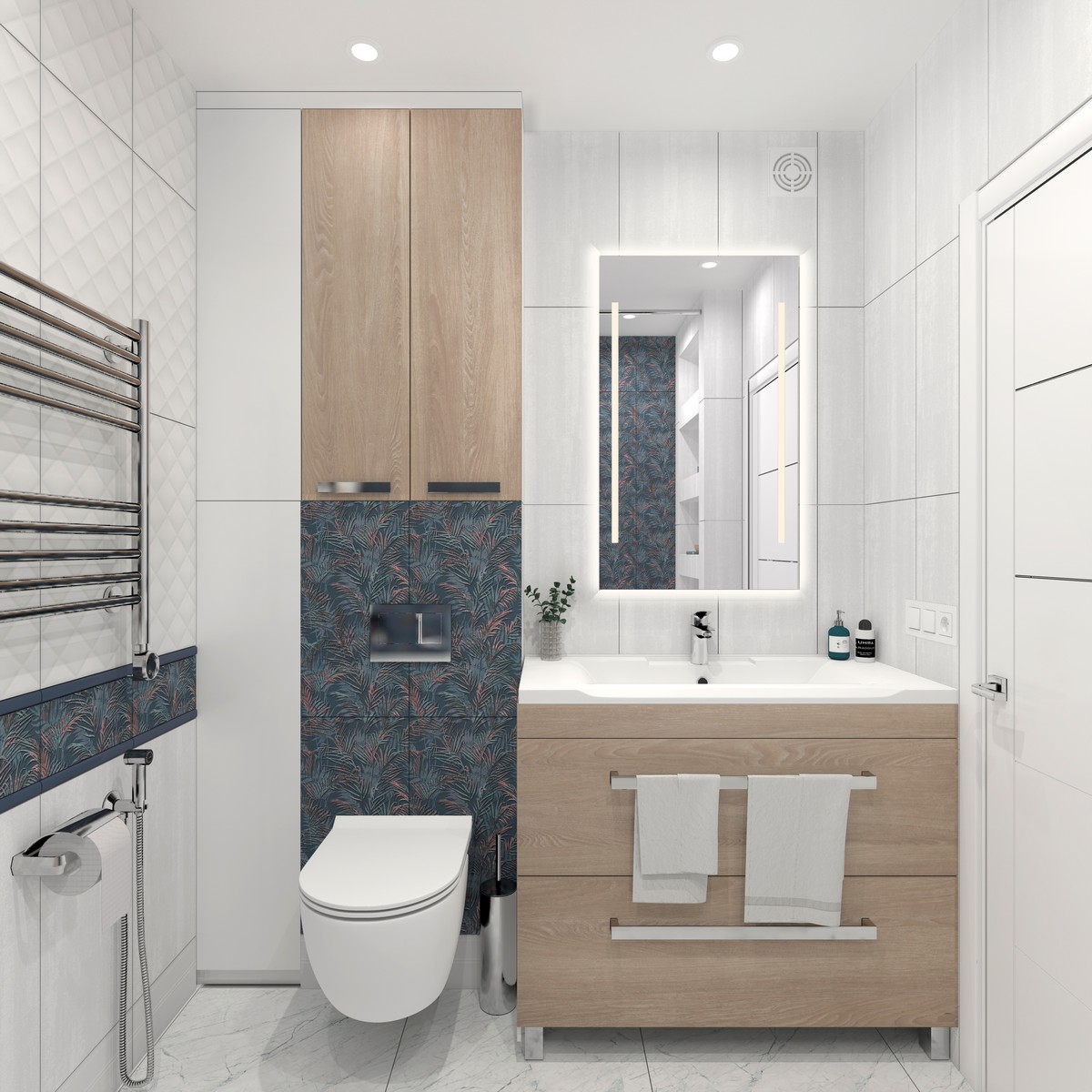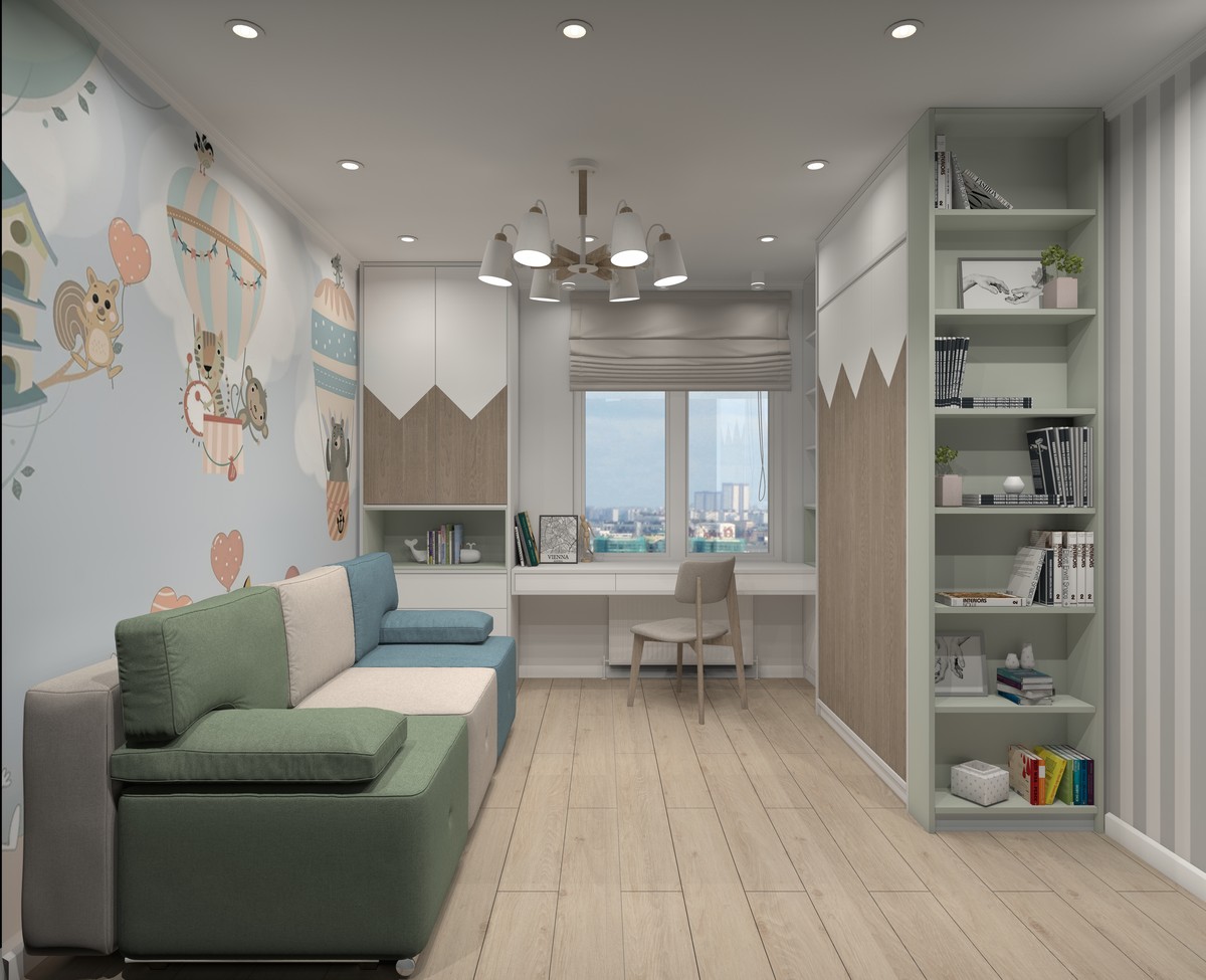 В квартире получилось организовать достойные места хранения в каждой комнате. Маленький СУ пожертвован под хозяйственную комнату, где расположилось постирочное и гладильное оборудование. Кабинет с помощью декора легко преображается в детскую.