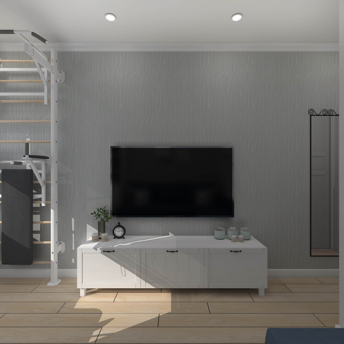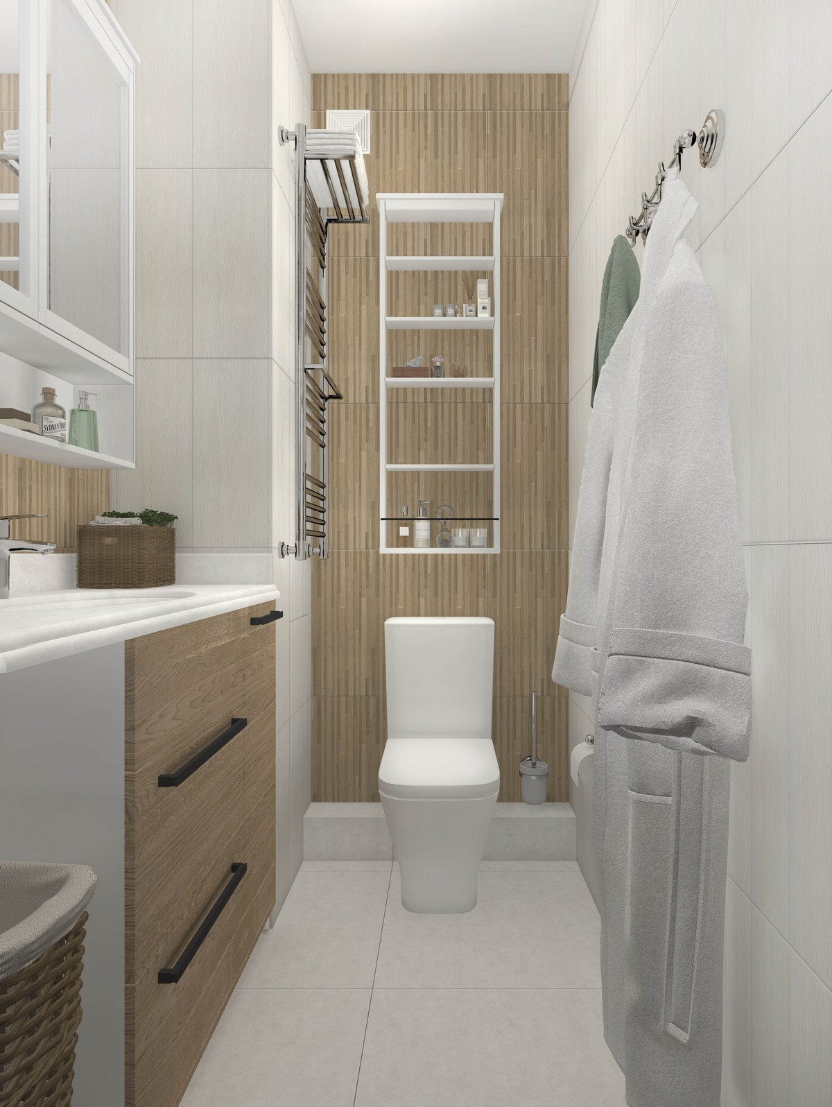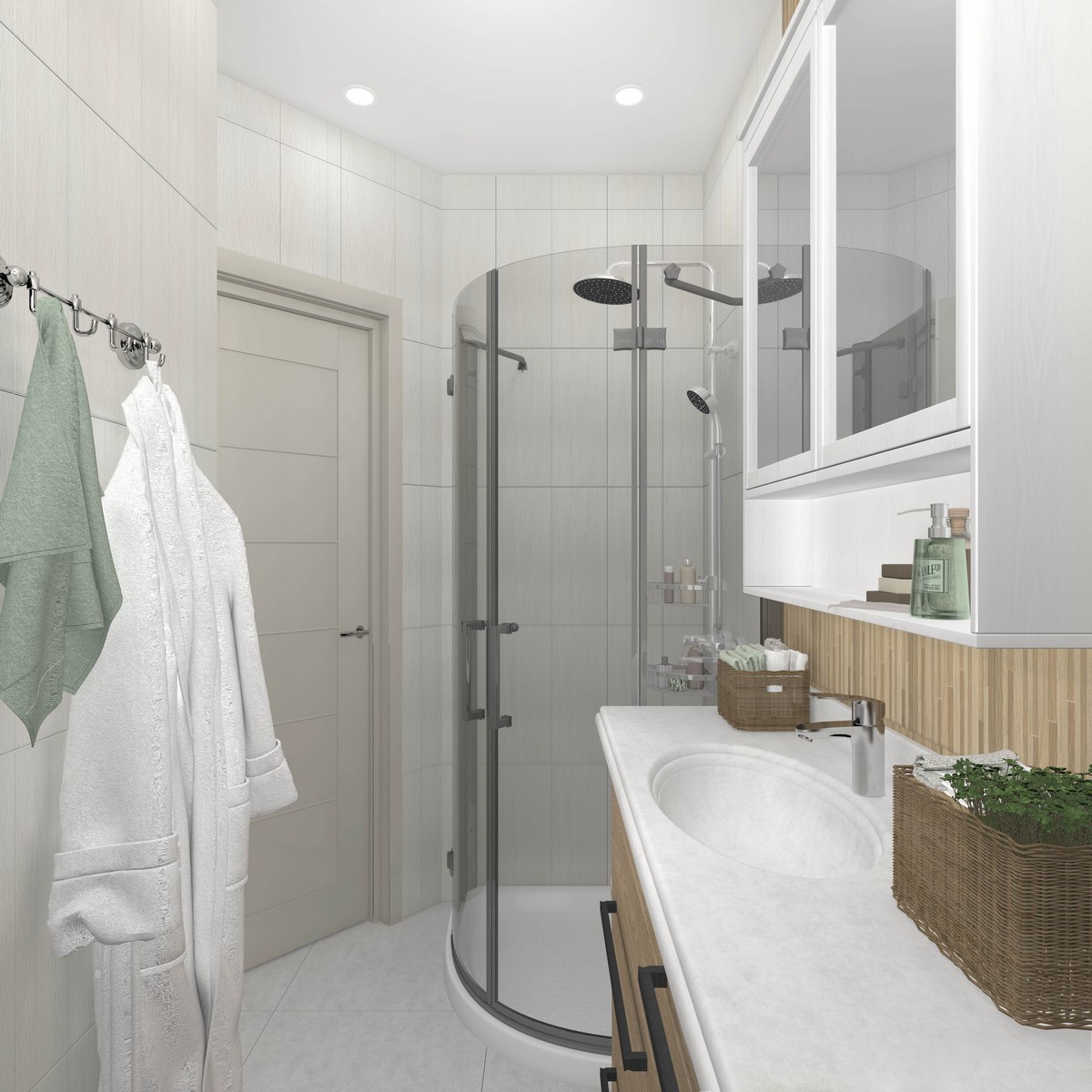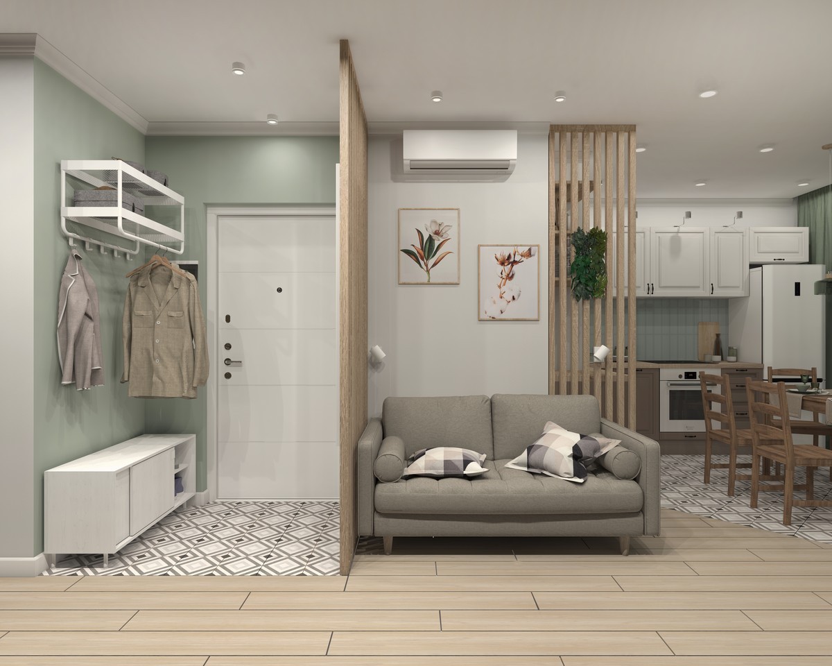 Зонирование общей зоны выполнено рейчатыми перегородками, что позволяет максимально использовать солнечный свет. Комната с душевой изначально будет оборудована под гардеробную.