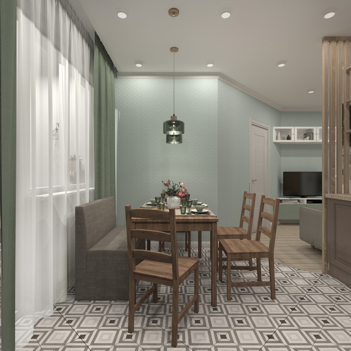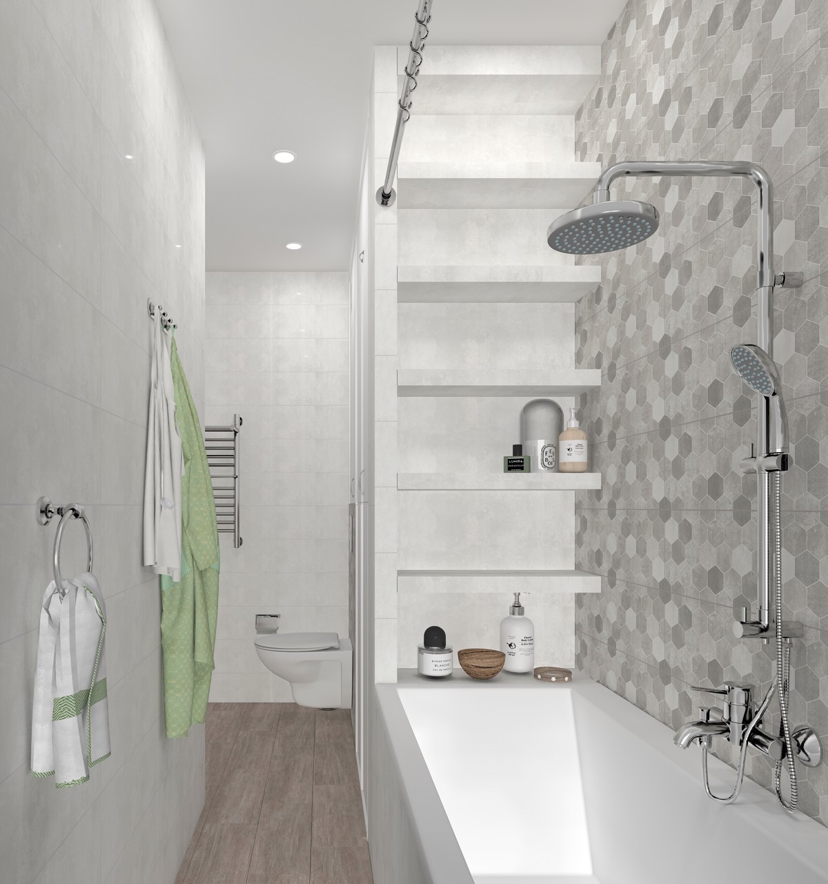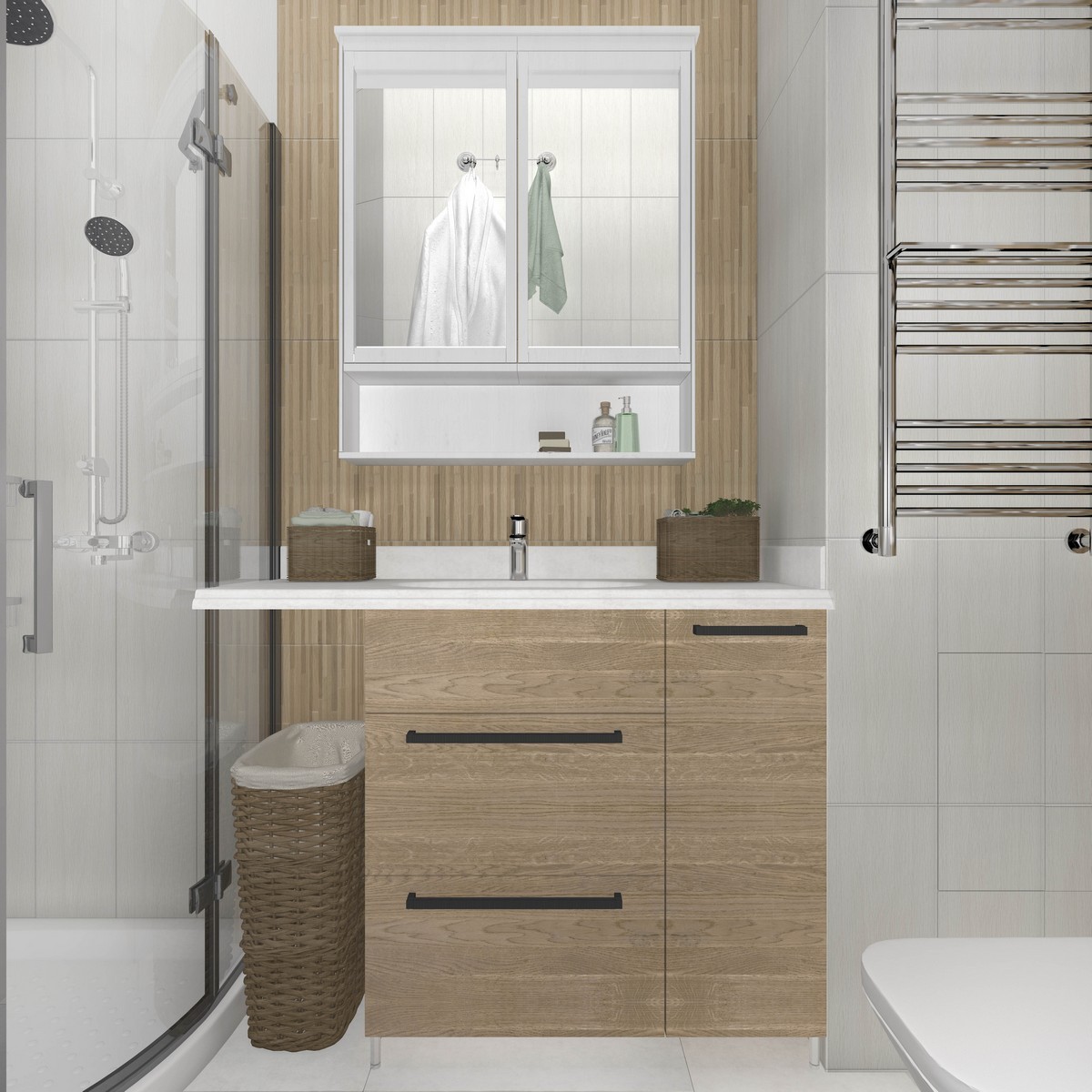 Зонирование общей зоны выполнено рейчатыми перегородками, что позволяет максимально использовать солнечный свет. Комната с душевой изначально будет оборудована под гардеробную.